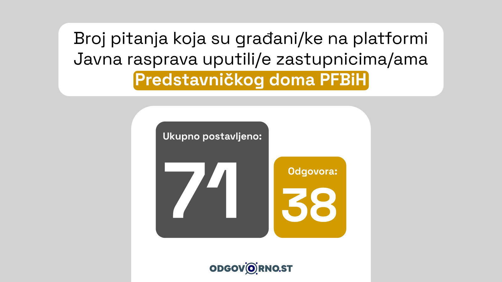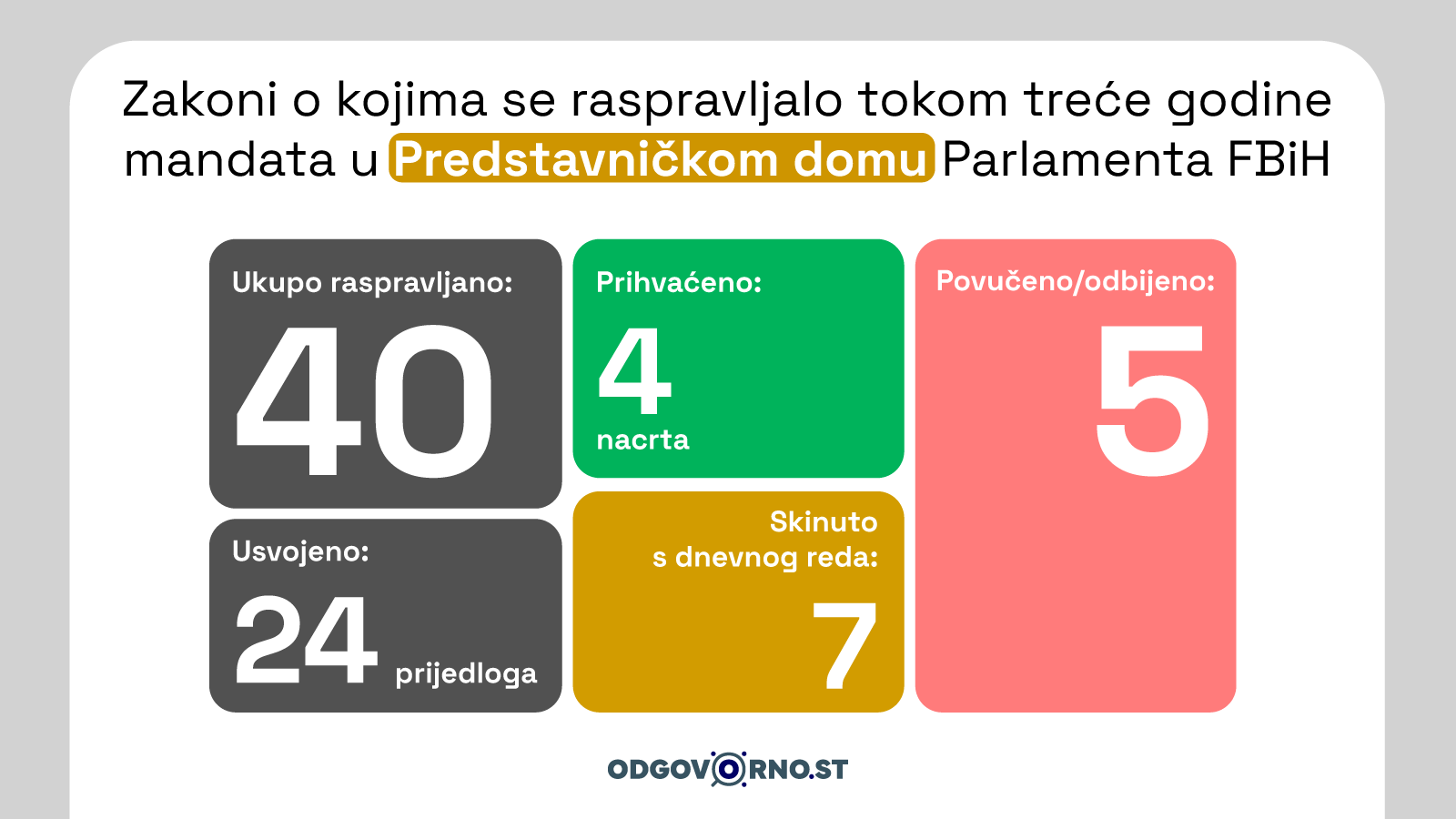 Iako statistika pokazuje određeni zakonodavni intenzitet, transparentnost rada Parlamenta FBiH i dalje je problematična. Zapisnici i izvještaji sa sjednica na službenim web stranicama oba doma objavljuju se sa zakašnjenjem, a ne postoji ni pregledna i sistematizirana lista svih razmatranih zakona. To znači da praćenje zakonodavne aktivnosti i dalje zahtijeva dodatno istraživanje i upoređivanje dokumenata.