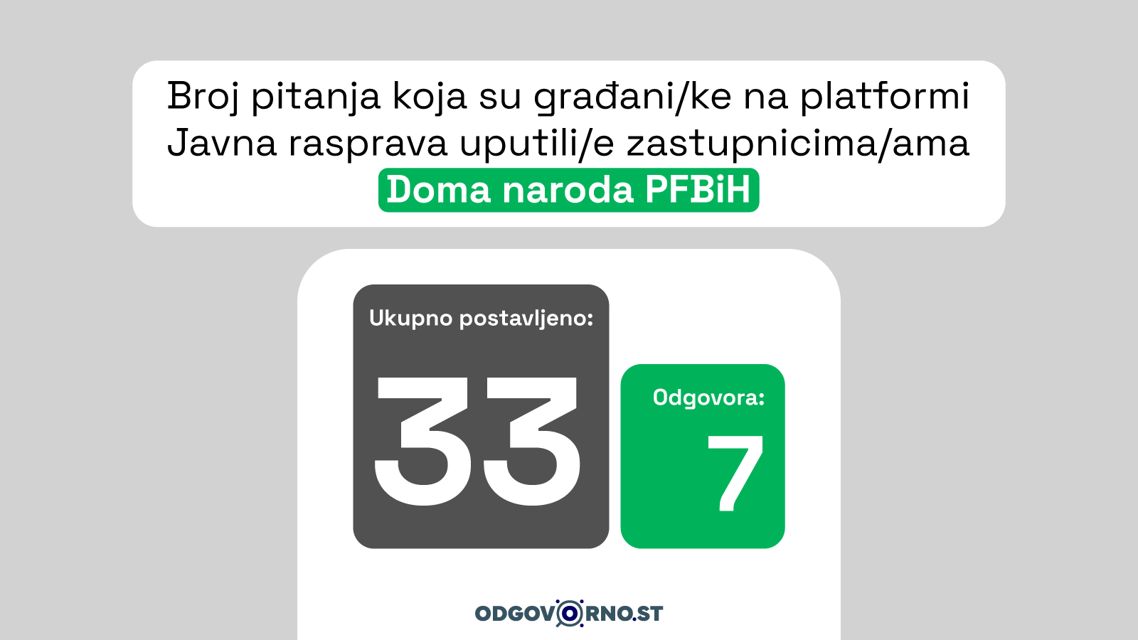 Delegatima/kinjama Doma naroda upućena su 33 pitanja, ali je odgovoreno na svega sedam. Delegat Almir Babajić (SDP) odgovorio je na gotovo sva pitanja koja su mu postavljena, dok je delegatkinja Miomirka Melank (NS) bila najaktivnija nakon njega. U komunikaciji s građanima/kama istakle su se i delegatkinje Sandra Imširović (DF) i Silva Banović (NiP).