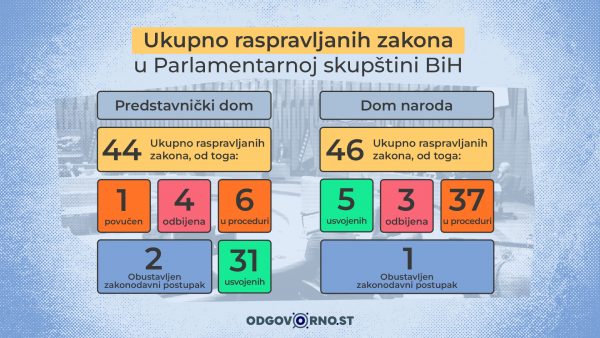 Parlamentarna skupština BiH razmatrala je u trećoj godini mandata desetine zakonskih prijedloga, pri čemu su u fokusu bili budžet, javne finansije i reforme u oblasti pravosuđa i sigurnosnog sektora. Iako je u Predstavničkom domu usvojen veći broj zakona nego u Domu naroda, značajan dio prijedloga ostao je u proceduri. Komunikacija parlamentaraca/ki s građanima/kama putem platforme Javna rasprava ostala je ograničena.